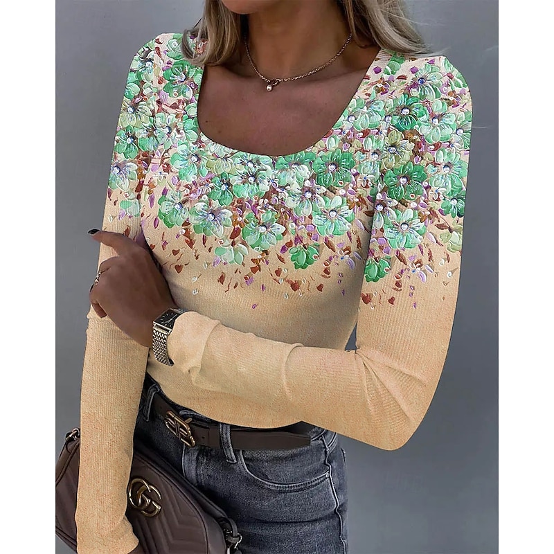 HOT ! Women's T Shirt Ribbed Graphic Square Neck Long Sleeve Casual Tunic Floral Plants Vintage Stylish Regular Tops Daily Print Pink Blue Orange Green Summer Spring Fall