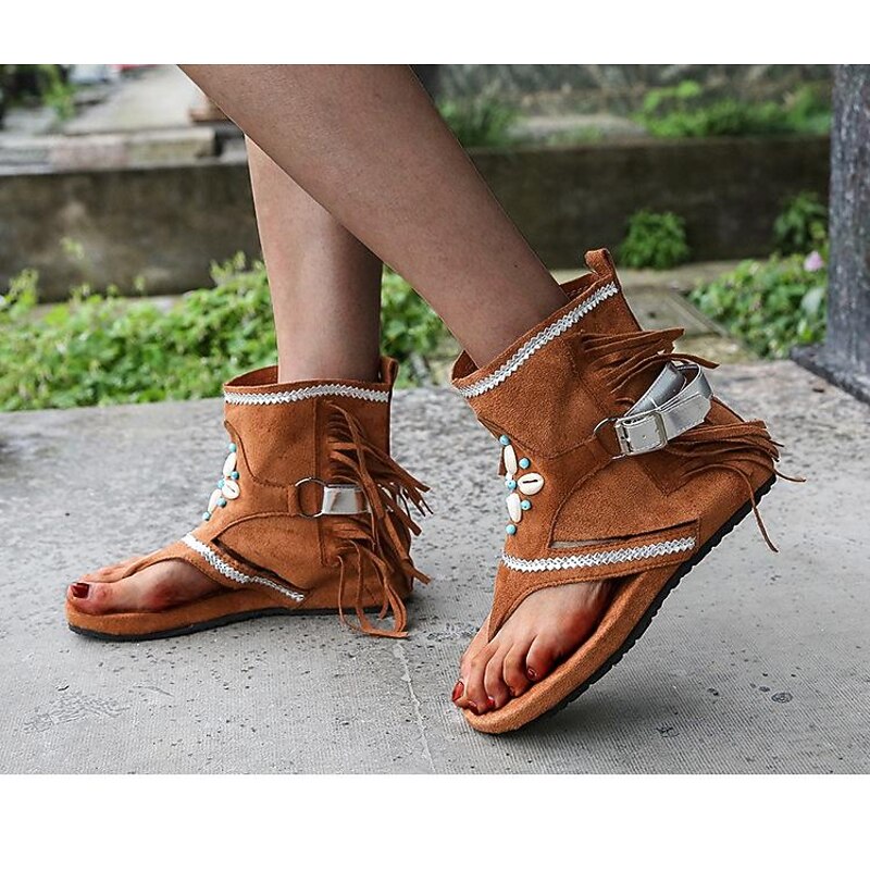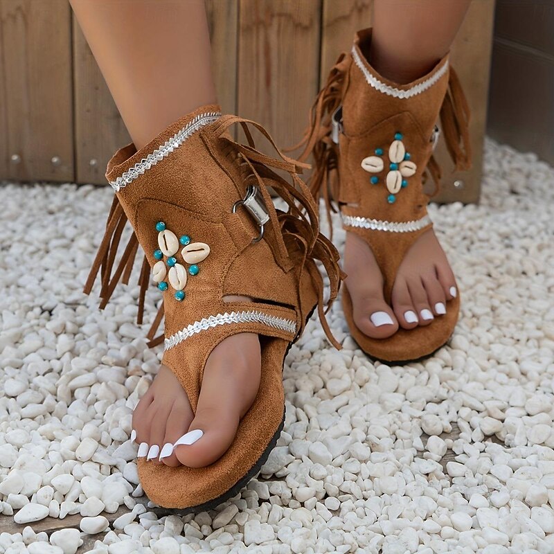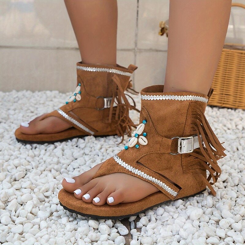 Women's Tassel Trendy Flat Sandals, Boho Style Open Toe Buckle Strap Thong Sandals Roman Beach Shoes Khaki Brown Black 18