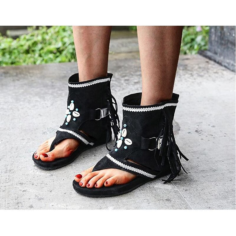 Highlights [Fabric] : Crafted from high-quality PU, these sandals are designed for a bohemian-inspired look with a soft suede finish, making them ideal for summer wear. [Silhouette] : These trendy flat sandals feature a comfortable flat heel, perfect for long walks or casual outings. [Design Highlights] : The sandals showcase intricate fringe details embellished with turquoise beads and small shell accents, complemented by a subtle silver trim for added elegance. A secure buckle strap ensures a snug fit, while the open-toe design enhances breathability and comfort. [Occasions] : Ideal for outdoor and beach settings, these sandals are versatile enough for both casual and stylish gatherings. Their boho beach style makes them a great addition to any vacation wardrobe. [Size Range] : Available in a broad size range from US5.5 to US10.5; please refer to the size chart provided by the supplier for the best fit.