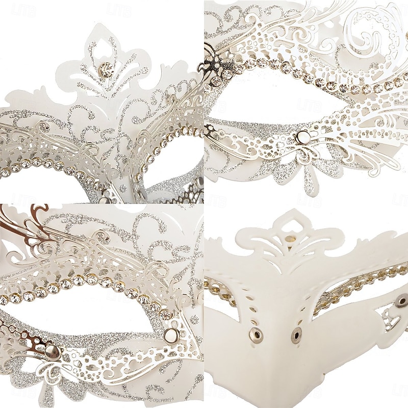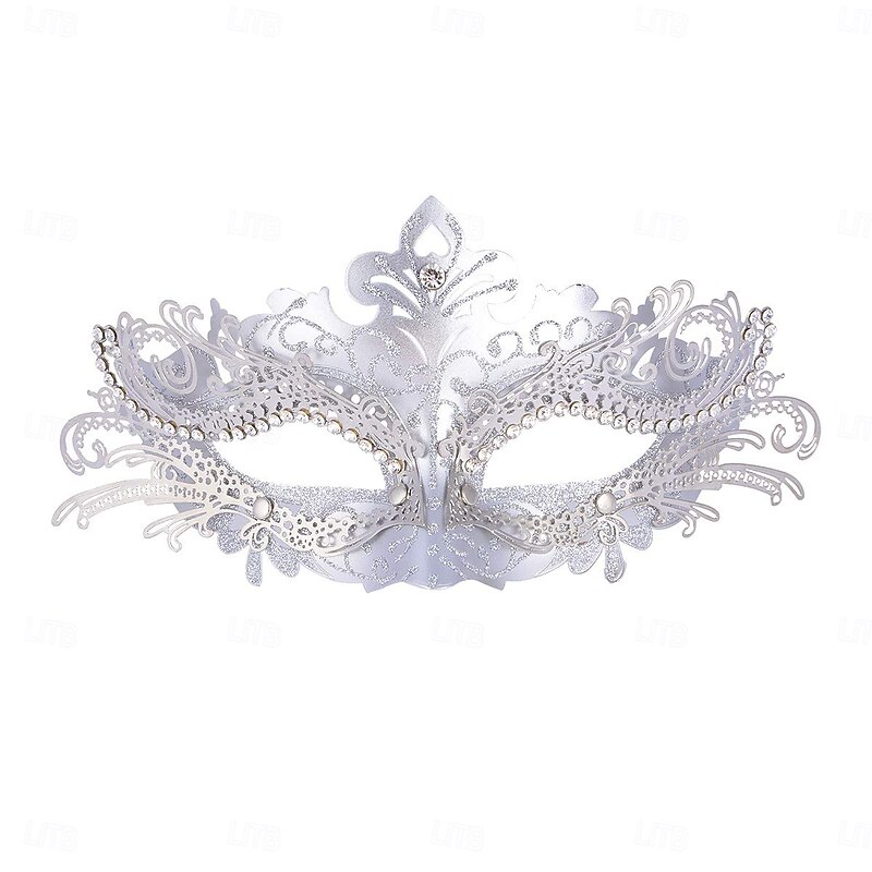 Highlights [Material and Fabric:] This Phantom Of The Opera Queen Carnival Mask is meticulously crafted with a lightweight plastic material that offers both ease of wear and long-lasting durability. The shimmering rhinestones and a sleek silver finish add an opulent touch to the design, perfect for capturing attention under any light. [Fit and Style:] The asymmetrical half-face style of this Venetian mask seamlessly conforms to various face shapes, providing both a mysterious and elegant allure. Its structured shape frames the eyes beautifully, while the secure satin ribbons ensure an adjustable and comfortable fit for all wearers. [Design Highlights:] The mask is adorned with delicate filigree work that exudes sophistication and timeless appeal. The strategic placement of sparkling rhinestones enhances the luxurious aesthetic, making it a standout accessory that complements any carnival costume. [Occasions:] Ideal for a range of events, including masquerade balls, theatrical performances, and festive gatherings such as Halloween, Carnival, and Mardi Gras. This versatile mask brings elegance and intrigue to any occasion, making it an essential accessory for those seeking to make a memorable impression. [Size:] Available in a one-size-fits-most design, this mask ensures compatibility with a variety of face shapes, offering a comfortable and secure fit for adult women.