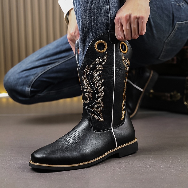 Men's Embroidered Faux Leather Cowboy Boots – Classic Western Riding Boots with Stitched Design for Outdoor, Country Dance and Casual Wear 6