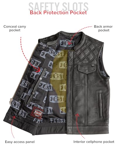 HOT ! First Mfg Co Signature Club Style Leather Vest - Diamond Cowhide Leather, Conceal Carry Pockets, Satin Liner