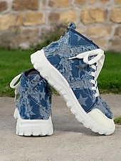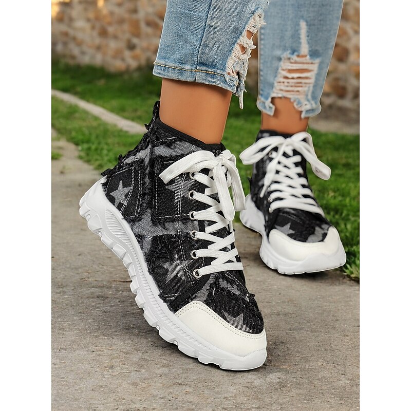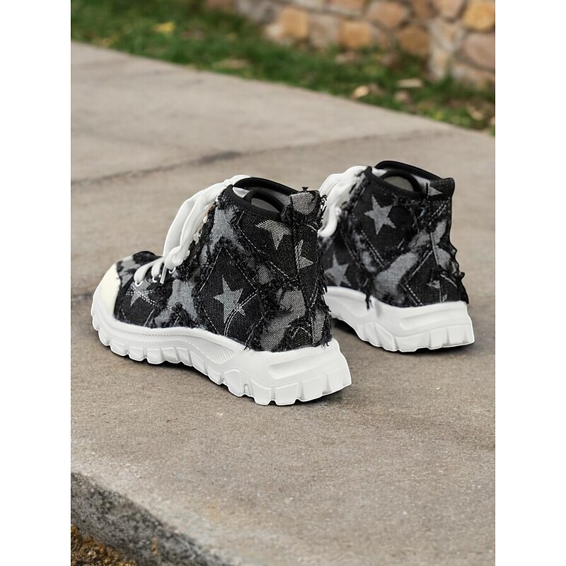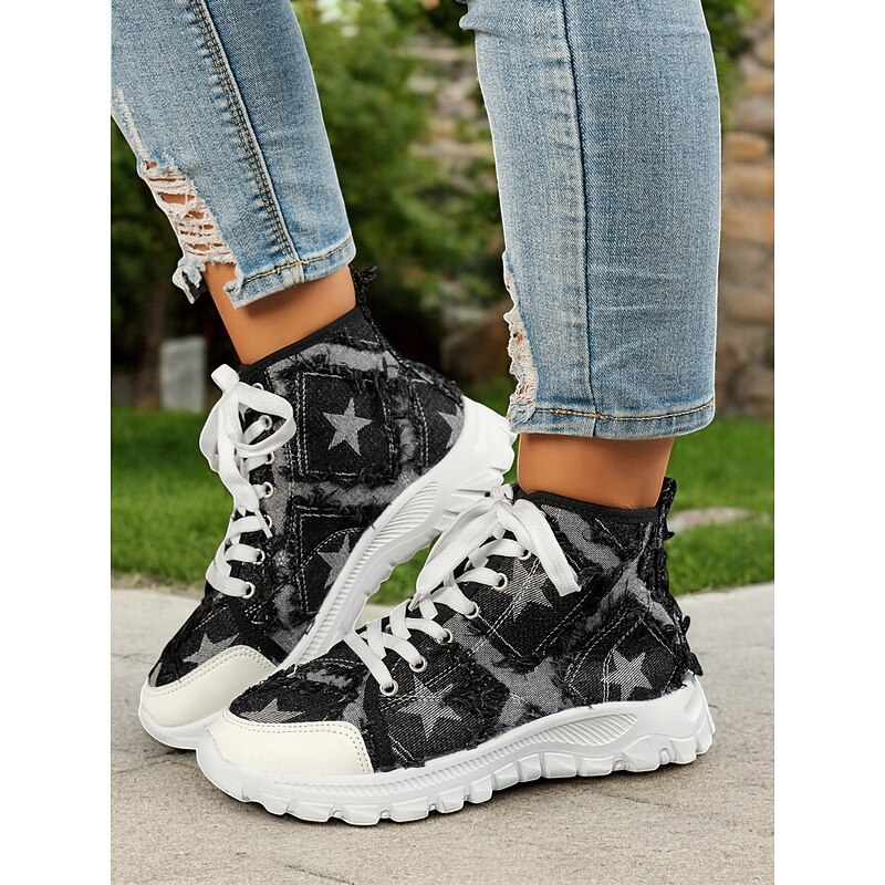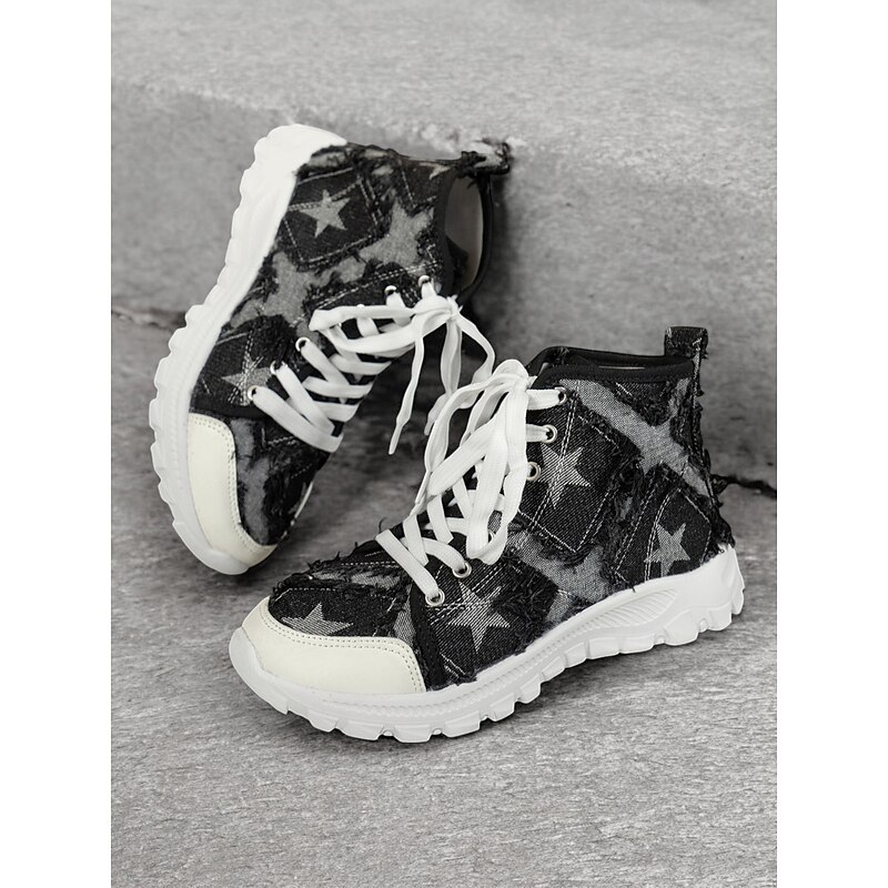 : Crafted from high-quality denim, these women's high-top sneakers feature a distressed finish for a trendy, rugged look. The denim material is adorned with a star pattern that adds a touch of visual intrigue, making these sneakers a standout choice for casual wear.