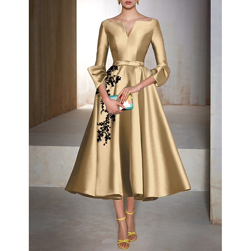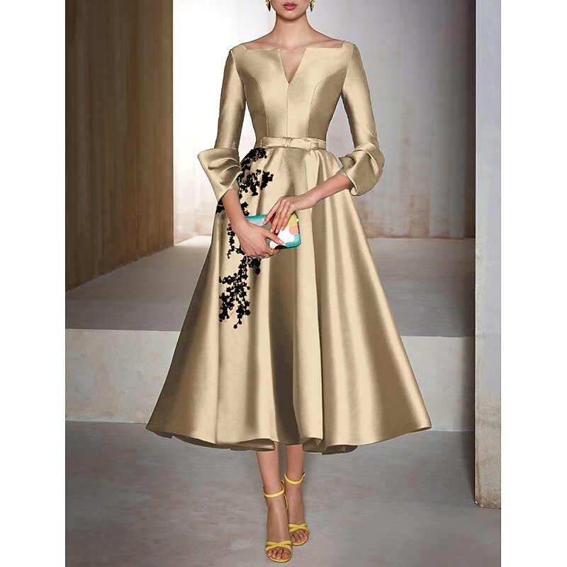 A-Line Cocktail Dresses Elegant Dress Wedding Wedding Guest Tea Length 3/4 Length Sleeve V Neck Satin with Bow(s) Appliques Dresses 3