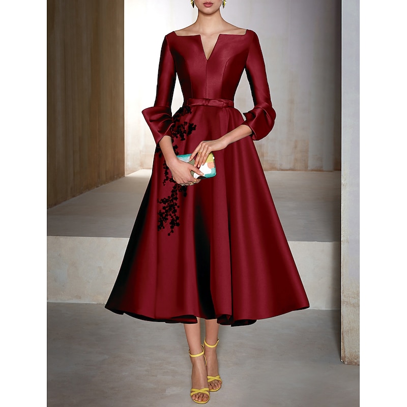 A-Line Cocktail Dresses Elegant Dress Wedding Wedding Guest Tea Length 3/4 Length Sleeve V Neck Satin with Bow(s) Appliques Dresses 1