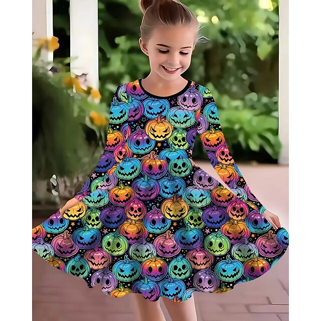 More information about Halloween Girls' 3D Halloween pumpkin Dress Long Sleeve Summer Spring Vacation Daily Holiday Princess Beautiful Sweet Kids 4-12 Years Casual Dress A Line Dress Knee-length Regular Fit