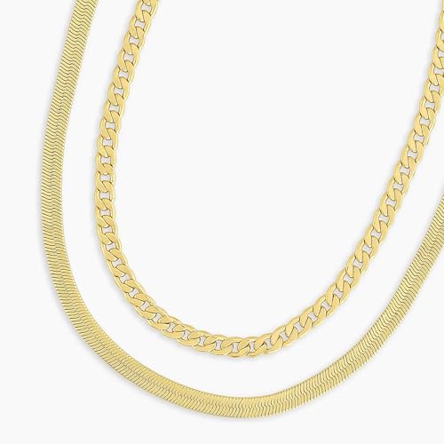 • Layered Gold Necklaces Set: The daity layered gold necklaces includes 2 chain necklace gold herringbone chain and cuban chain.These gold necklaces stack are versatile and looks great with both casual and formal wear,and you can wear either single or stacked to match different styles of clothing. This gleaming elegant layering gold necklaces for women will give you a stunning and delicate look and perfect for adding a touch of elegance to any outfit