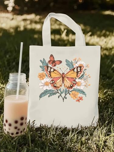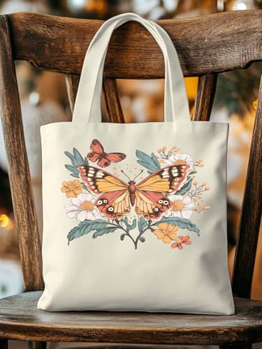 HOT ! Boho Vintage Flower Butterfly Canvas Tote Bag, Aesthetic Canvas Tote Handbags for Women Shoulder Bag