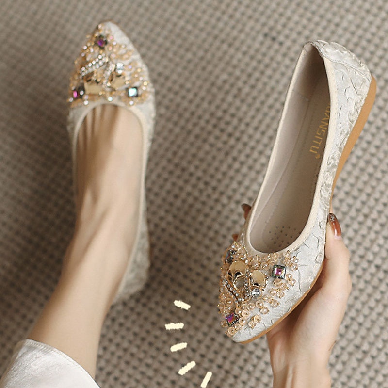 Highlights - Experience comfort and quality with affordable prices when you slip into our shoes! - Achieve a breezy and comfortable style with our shoes that are perfect for pairing with your favorite pants and jeans. - Our fashion flats provide long-lasting comfort and steady steps for any task, from daily wear to standing work, walking, casual outings, shopping and travel. - Our shoes are made with Satin upper materials and adorned with Rhinestone embellishment, perfect for weddings and other special occasions.