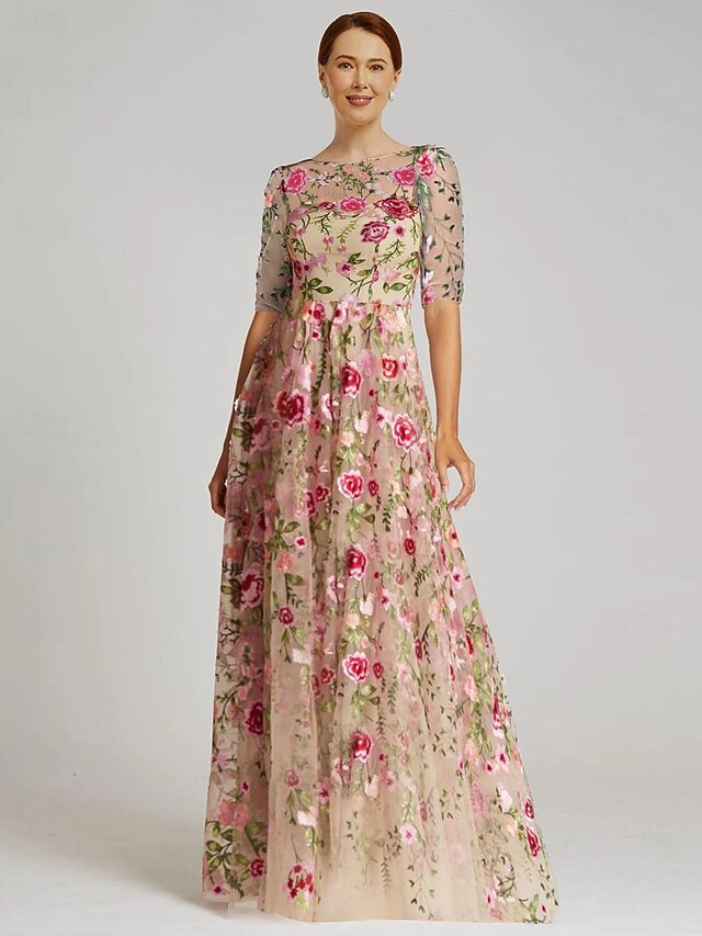 Floral Embroidered A-Line Mother of the Bride Dress Formal Elegant Vintage Illusion Neck Floor Length Tulle Half Sleeve with Appliques Flower 1