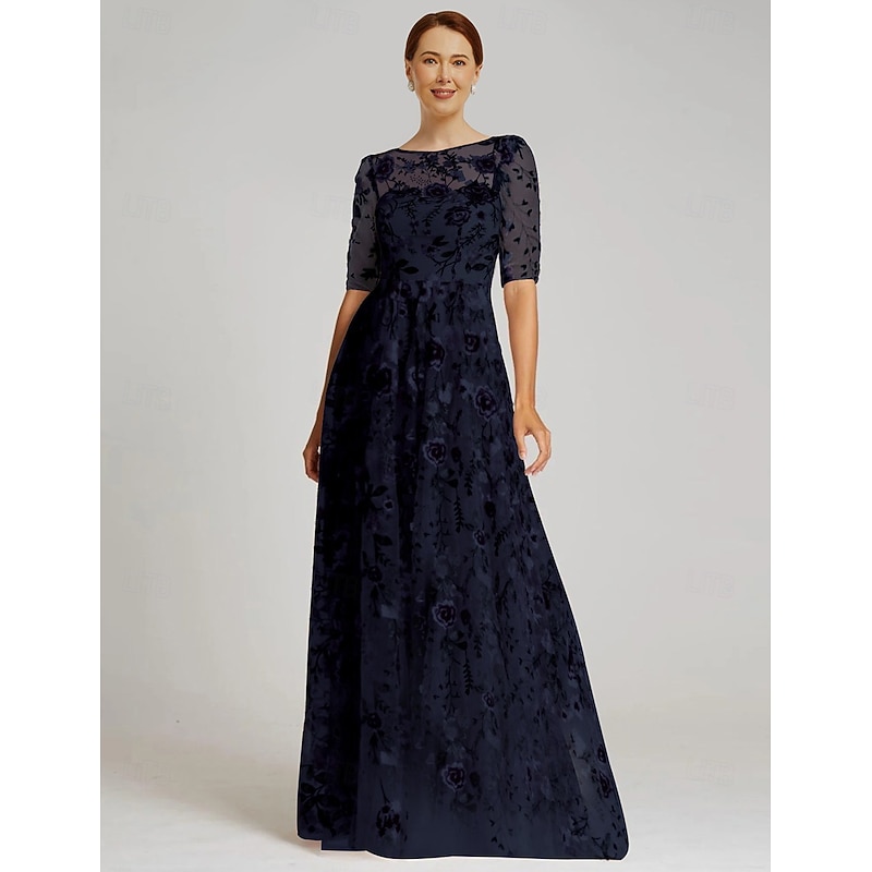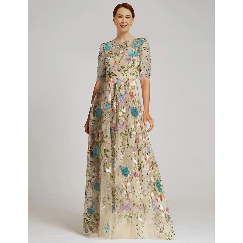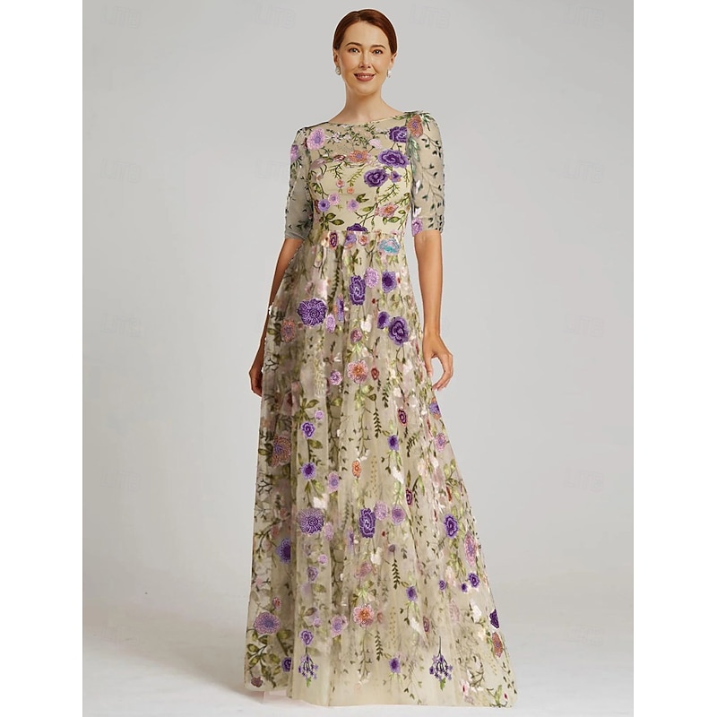 More information about Floral Embroidered A-Line Mother of the Bride Dress Formal Elegant Vintage Illusion Neck Floor Length Tulle Half Sleeve with Appliques Flower