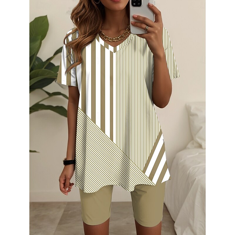 HOT ! Women's Fashion T Shirt Shorts Sets Short Sleeve V Neck Graphic Striped Print Casual Daily Blue Purple Green Summer Loose Fit