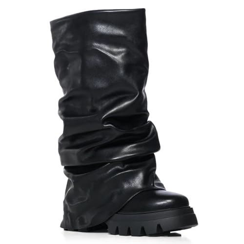 Yishaweiqi Slouched Ruched Fold Over Boots for Women Wide Calf Platform Chunky Heel Mid Calf Shark Boots 6