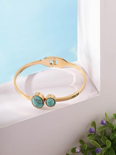 MINACHI Bohemian Retro Stainless Steel Created Turquoise Inlaid Round Plate Design Bangle Bracelet For Women 4