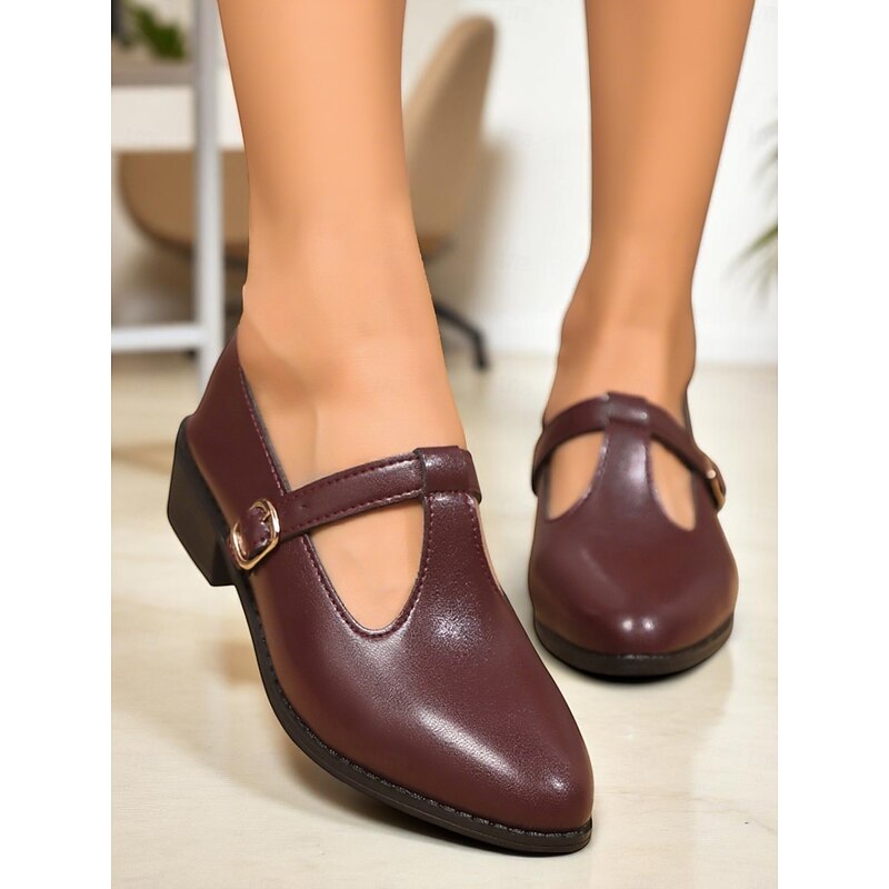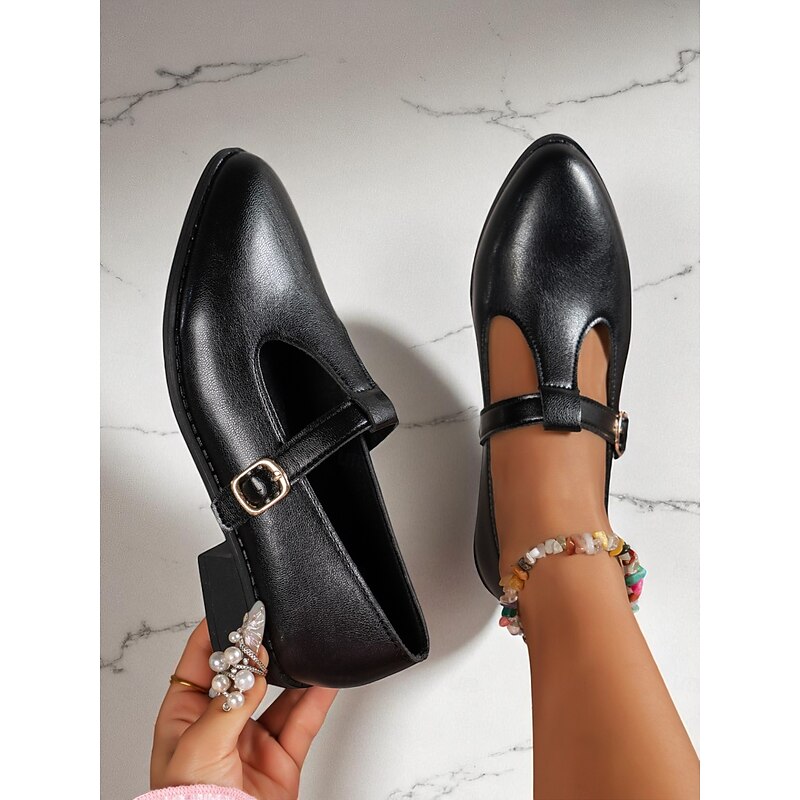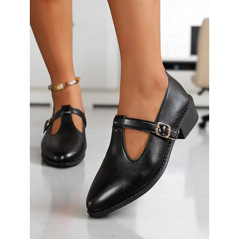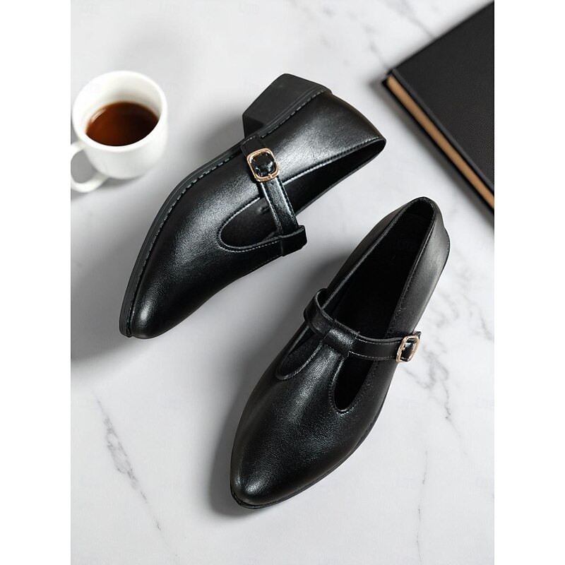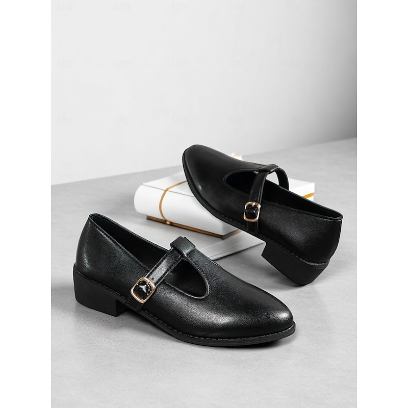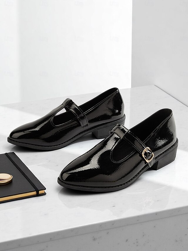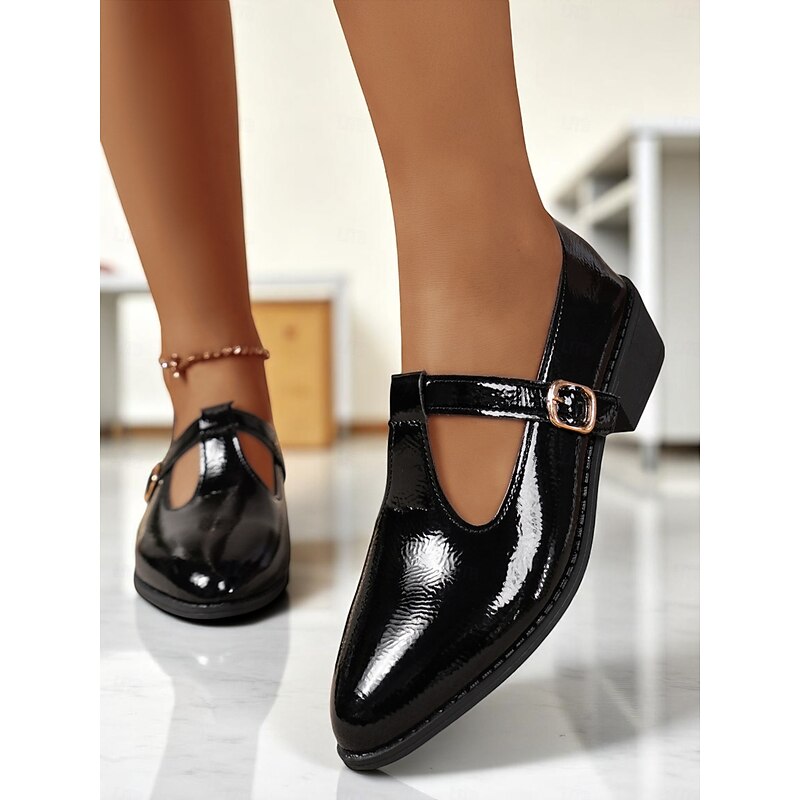 HOT ! Women's Black Patent T-Strap Mary Jane Shoes – Pointed Toe Low Block Shoes for Office, School and Semi-Formal Events