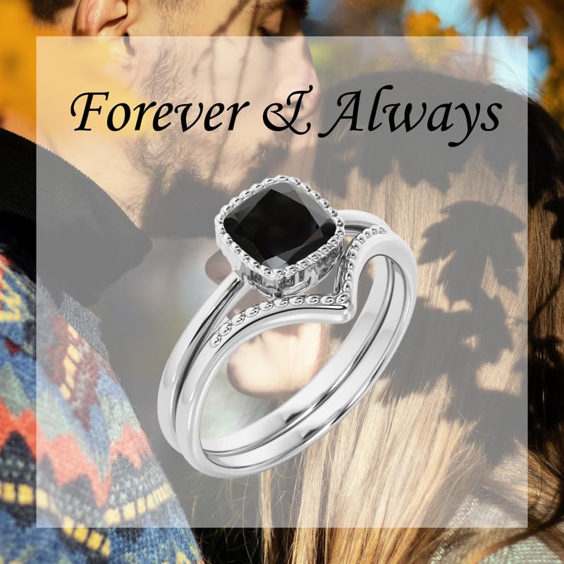 Black Onyx Wedding Ring Set for Women 925 Sterling Silver 10K 14K 18K Gold Vintage Bridal Ring Set with 1CT Cushion Cut Black Onyx Engagement Ring Set for Her 2