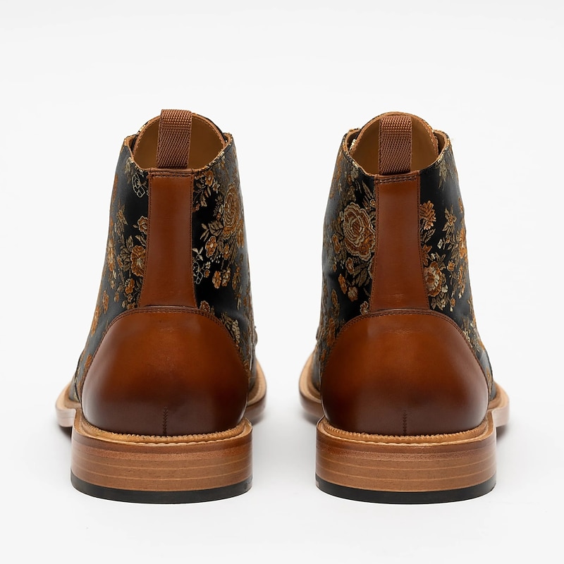 Men's Floral Jacquard and Brown Faux Leather Lace-Up Boots - Vintage Oxford Ankle Boots with Retro Style for Casual and Formal Wear 5