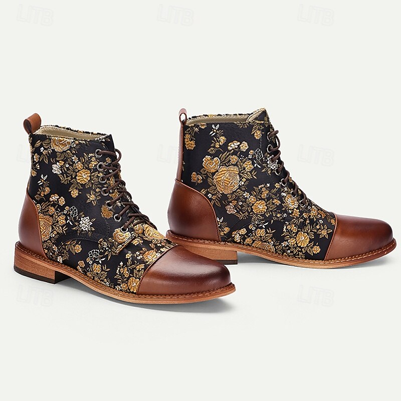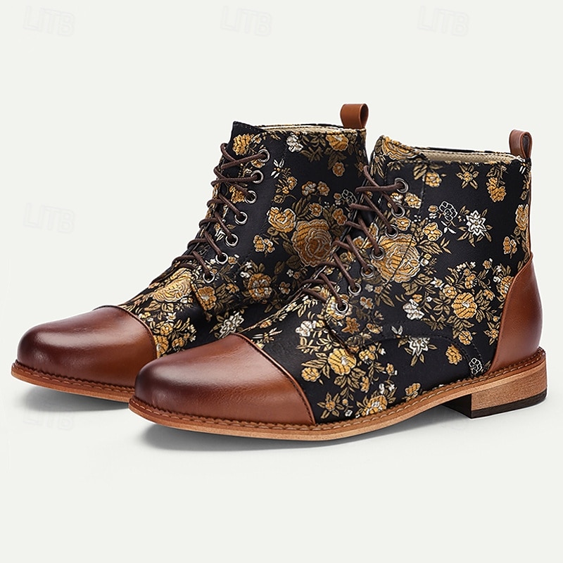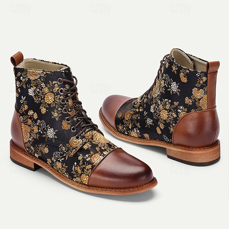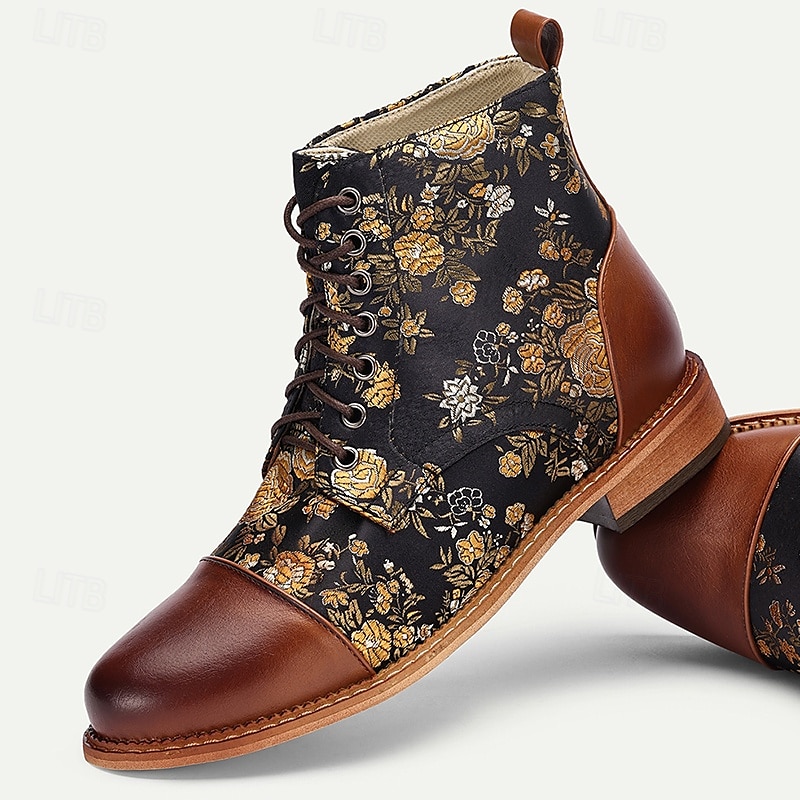 HOT ! Men's Floral Jacquard and Brown Faux Leather Lace-Up Boots - Vintage Oxford Ankle Boots with Retro Style for Casual and Formal Wear