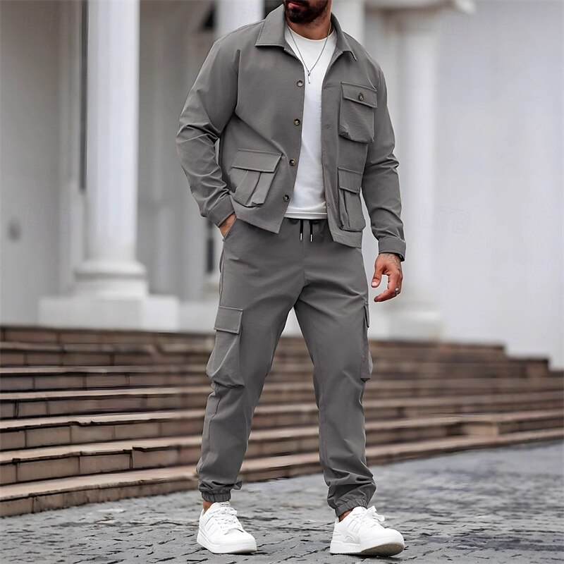 More information about Men's Lightweight Jacket Cargo Jacket Casual Jacket Set Vacation Daily Breathable Pocket 2 Piece Spring Fall Plain Fashion Classic Lapel Regular Black Khaki Army Green Dark Blue Gray Jacket