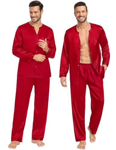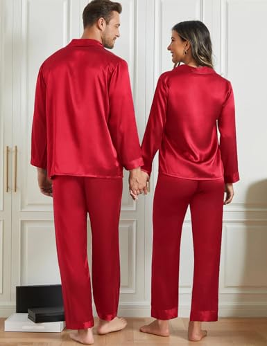 • CLASSIC DESIGN: Matching sleepwear pj set for couples features buttons which is easy to put on and take off. A soft satin pajama set is a button-down shirt with long loose pants, suitable for many seasons and occasions. Pajama pant's waistbands are stretchy for a better fit. Pajama bottoms have 2 side pockets for added storage, you can store some small things. Great for sleeping, casual wear, or lounging around the house or yard all day.
