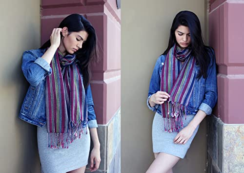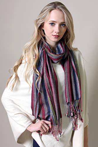 • TRENDY blue and red multicolor fashion stripe scarf with long tassels. Featuring shades of blue, red, maroon, green and subtle metallic silver threads for a dressy shimmering look.