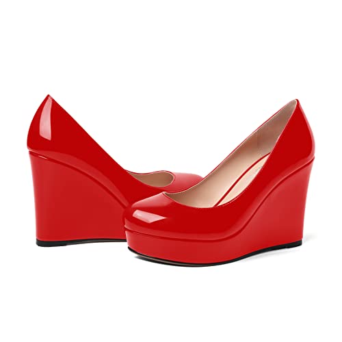 MOVINSTEPS Womens Party Round Toe Solid Patent Sexy Platform Slip On Wedge High Heel Pumps Shoes 4 Inch 4