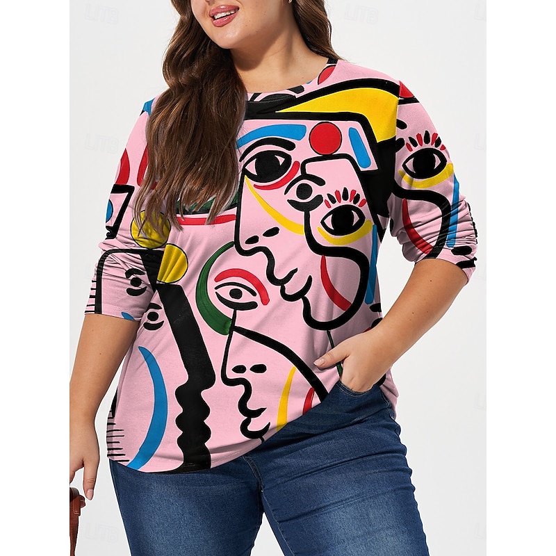Highlights [Fabric] : Crafted from high-quality polyester, this women's long-sleeve t-shirt offers a soft and comfortable feel, perfect for all-day wear during the fall and winter seasons. The micro-elastic material ensures a relaxed fit, providing both comfort and flexibility. [Fit] : The top features a regular fit with a classic crew neck design, offering ease of movement and a flattering silhouette for plus-size individuals. Its regular length makes it versatile and easy to pair with various bottoms. [Design Highlights] : This vibrant tee showcases an artistic abstract print in bold hues of red, blue, yellow, and green, injecting a splash of creativity into your wardrobe. The eye-catching face design combined with the long sleeves provides a unique and stylish look. [Occasions] : Ideal for daily casual wear, this t-shirt is perfect for adding a pop of color to everyday outfits. Whether you're heading out for a relaxed weekend outing or running errands, this top provides a stylish and comfortable option. [Size Range] : Available in plus sizes ranging from 1XL to 4XL, this t-shirt is designed to accommodate women looking for fashionable and comfortable clothing options that suit their style and size needs.