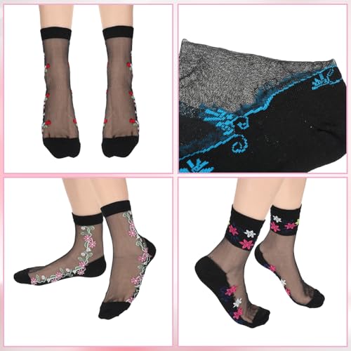 5 Pairs Sheer Black Socks Mesh Transparent Socks for Women Ultrathin Fishnet Floral See Through Sock Lace Ankle Sock Candy Womens Sheer Ruffle Summer Stockings 6