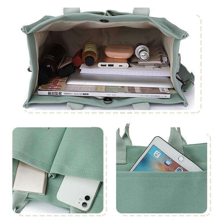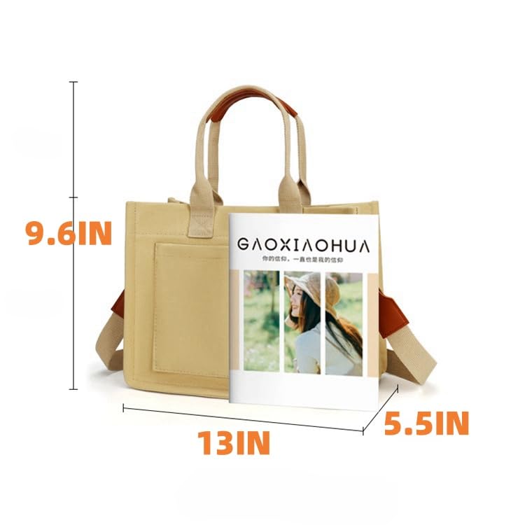 • Handbag size: This women's canvas handbag features a multi pocket design that keeps your items organized. Includes 1 convenient front pocket for storing small cards, and 5 inner pockets for storing mobile phones, keys, wallets, books, cosmetics, water bottles, and other daily necessities. This small canvas handbag measures 9.06 inches x 5.91 inches x 8.27 inches, while the large handbag measures 12.6 inches x 5.51 inches x 11.42 inches. Can accommodate your daily essentials.