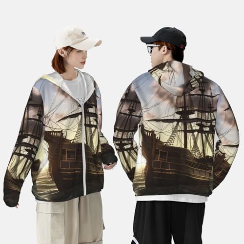 HOT ! Men's Sun Protection Shirts Pirate Ship and Sea Long Sleeve Sun Shirt for Fishing Running Hiking Swim