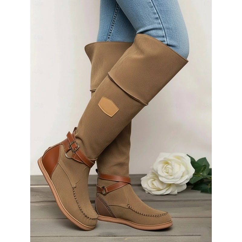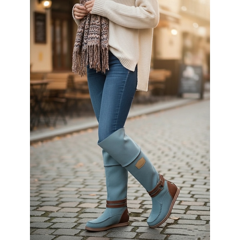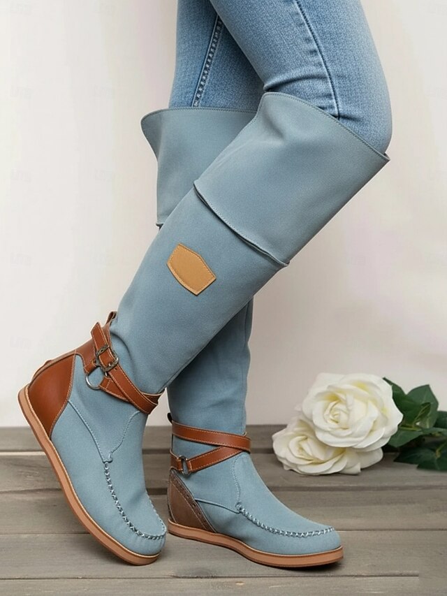 HOT ! Women's Suede Knee-High Boots with Wedge Heel and Buckle Strap - Bohemian Style Casual Boots in Denim Blue
