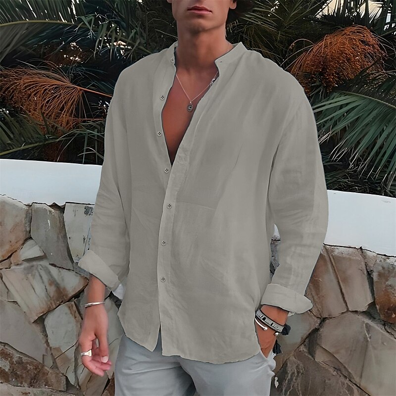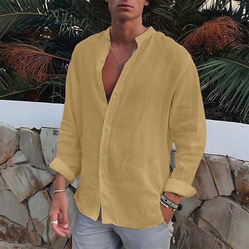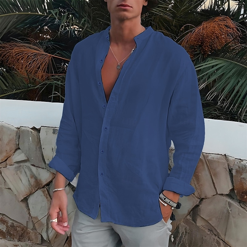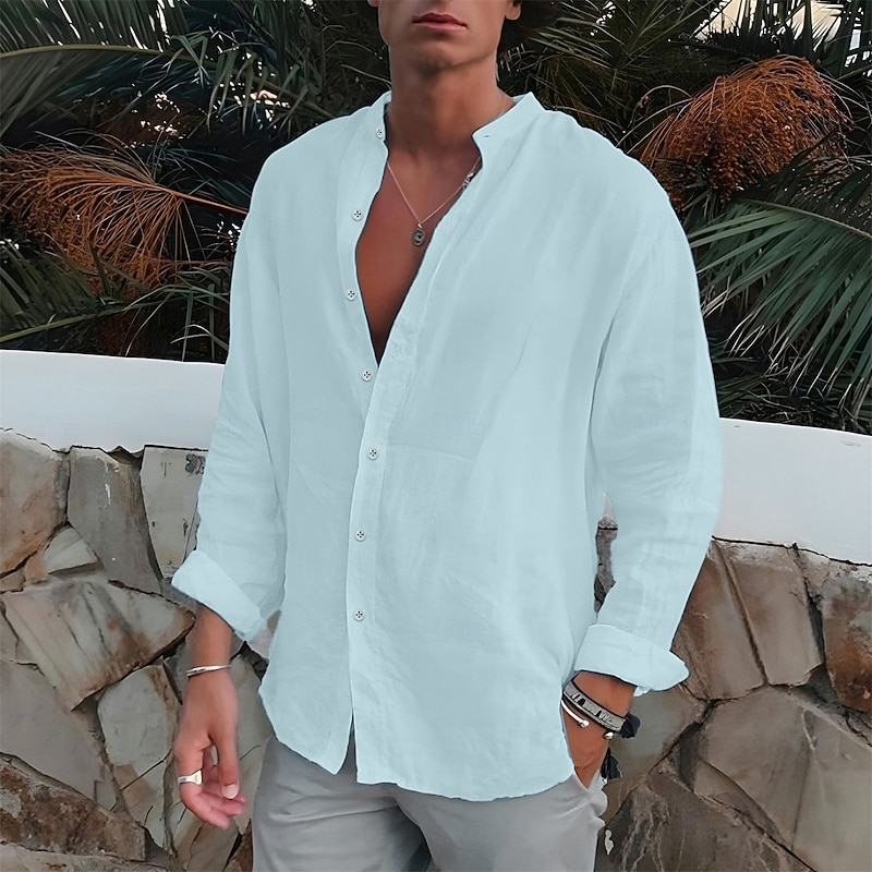 More information about Men's Shirt Band Collar Shirt Summer Shirt Beach Wear Button Up Shirt Plain Outdoor Vacation Black White Blue Green Long Sleeve Turndown Spring & Fall Clothing Apparel