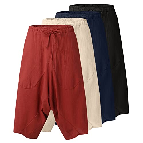 Men Linen Capri Pants Drop Crotch Wide Leg Baggy Harem 3/4 Shorts Pants Japanese Casual Cropped Beach Yoga Trousers 4