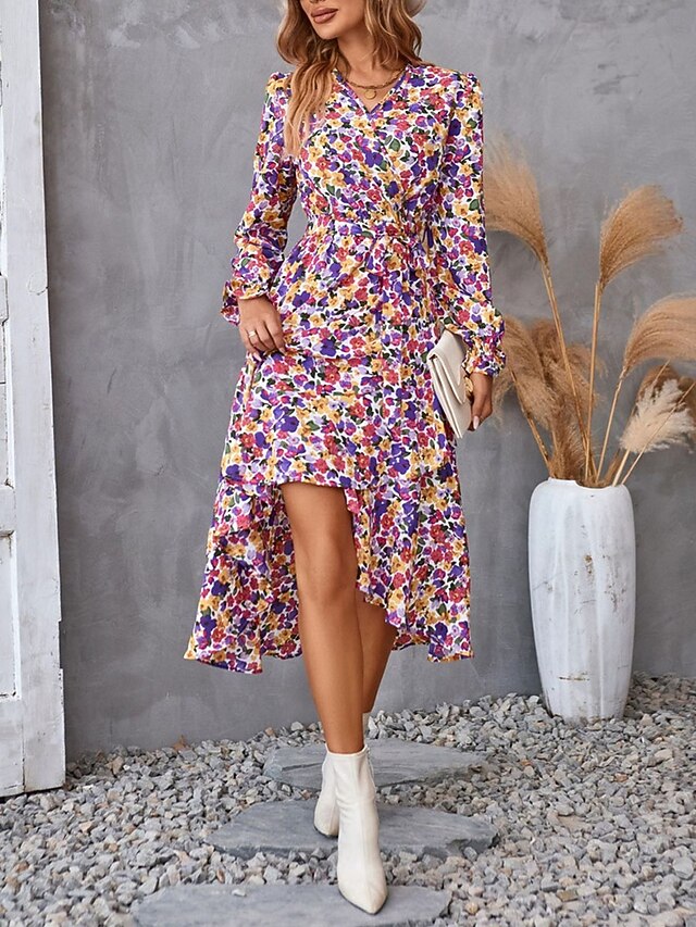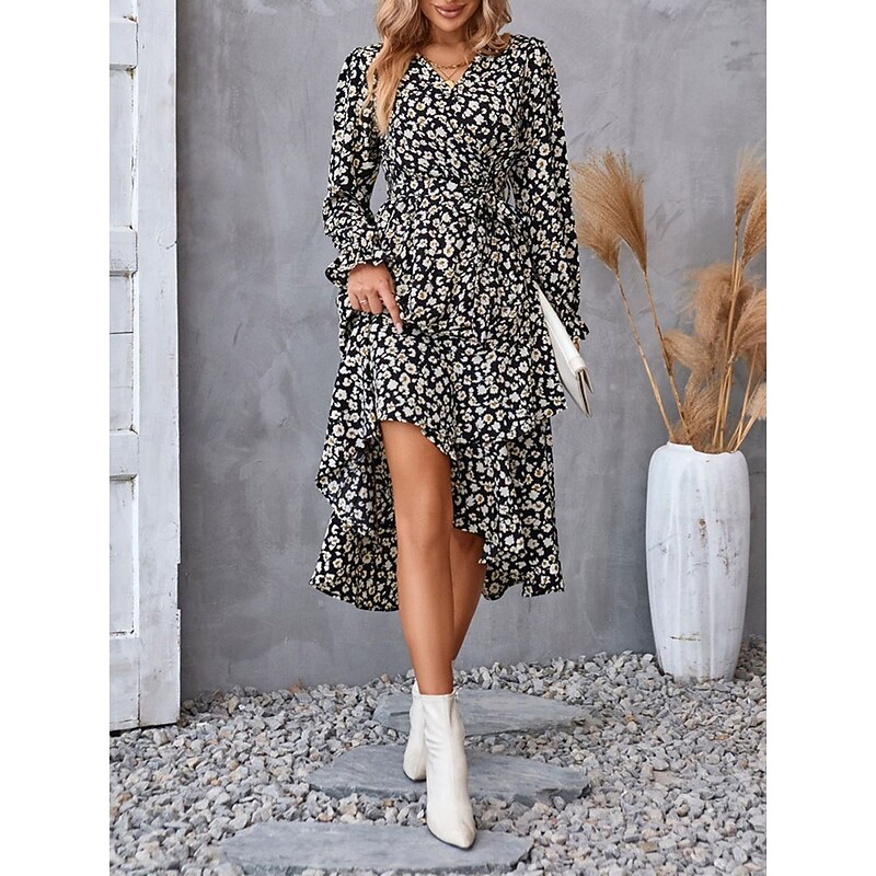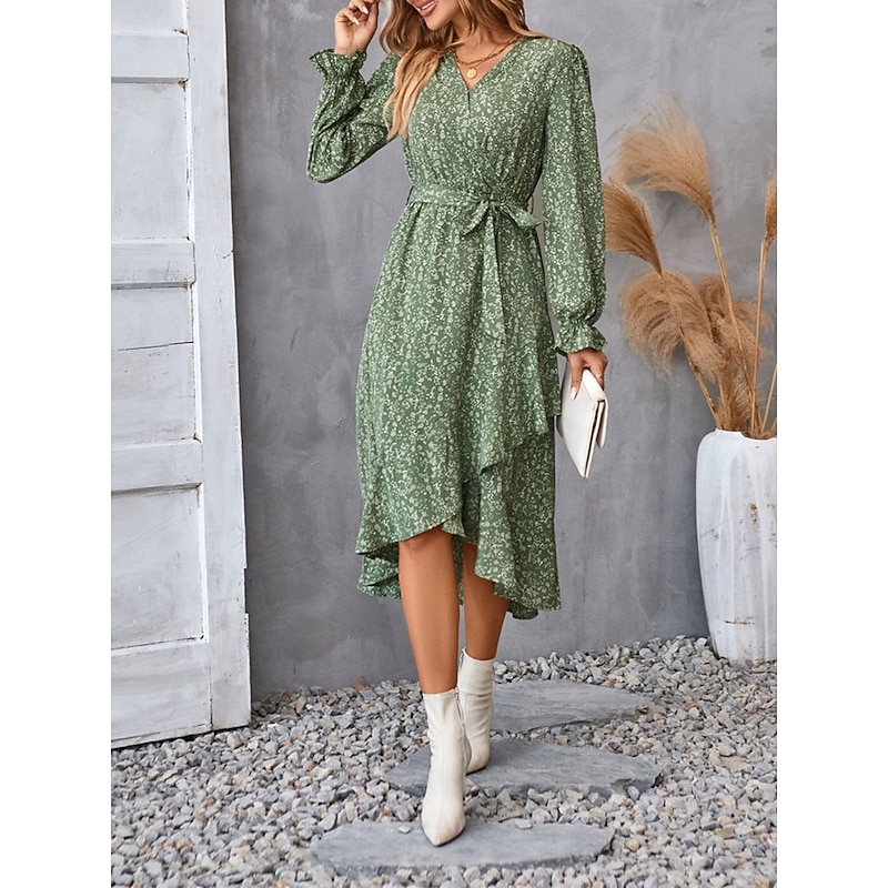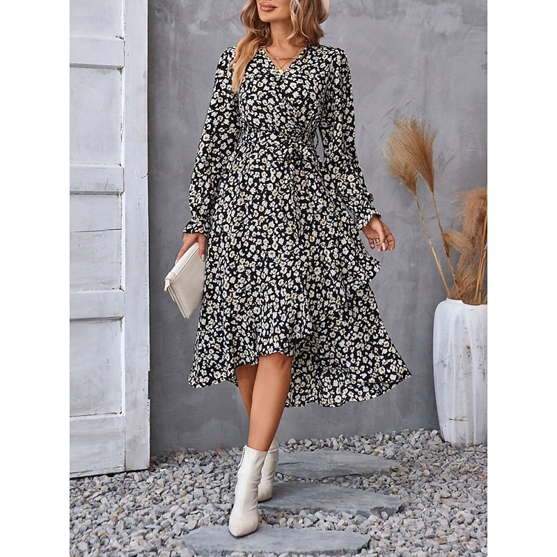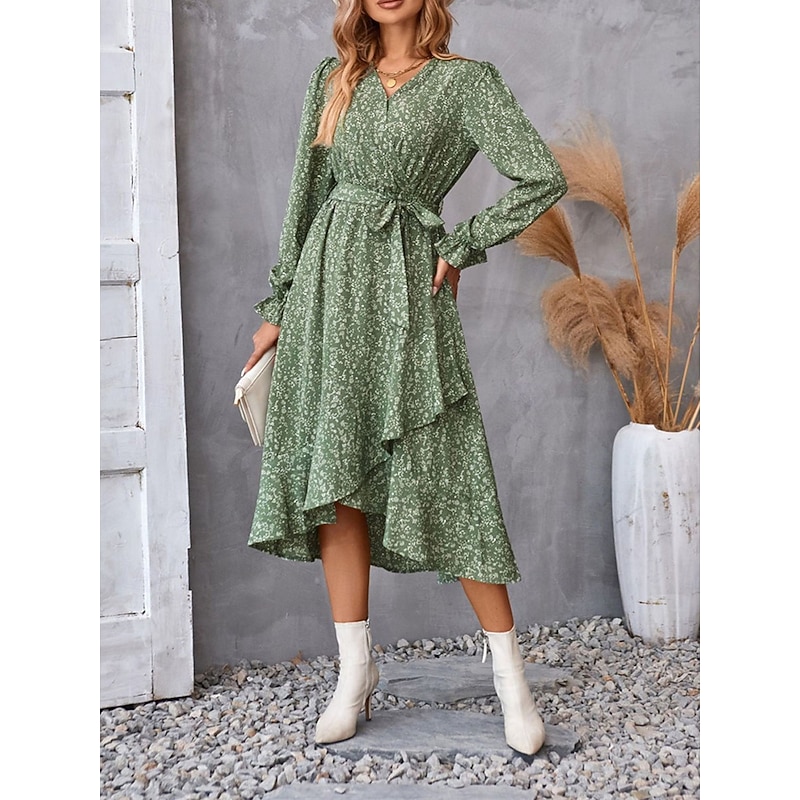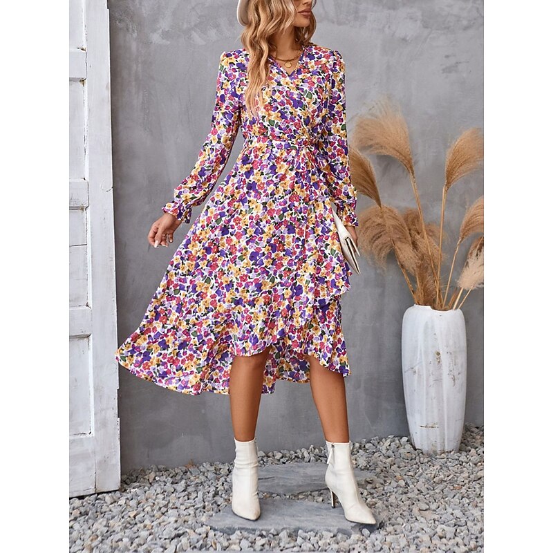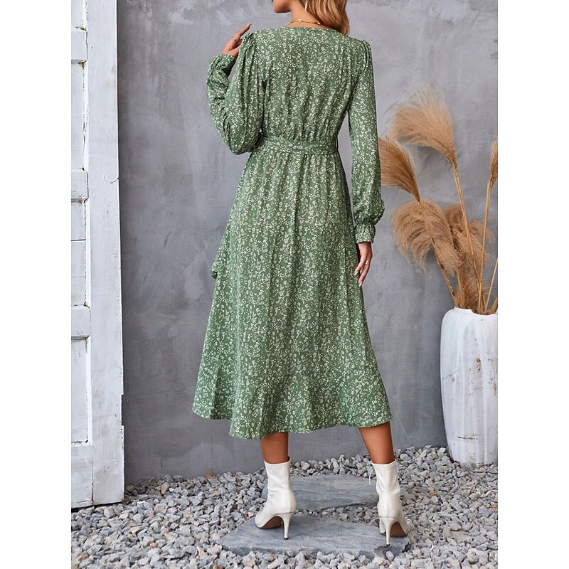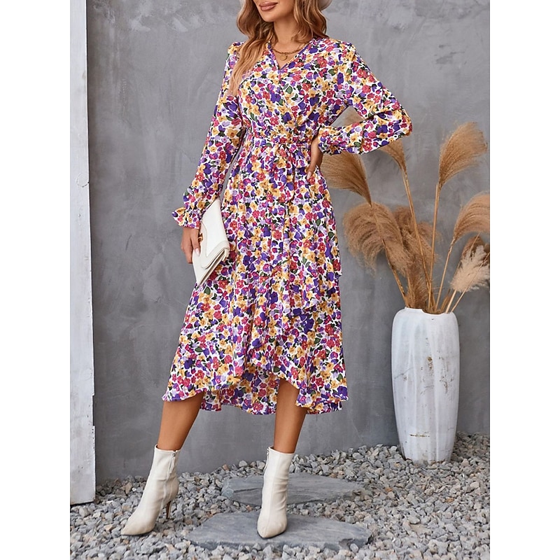 Women's Floral V Neck Midi Dress Long Sleeve Summer Spring 2