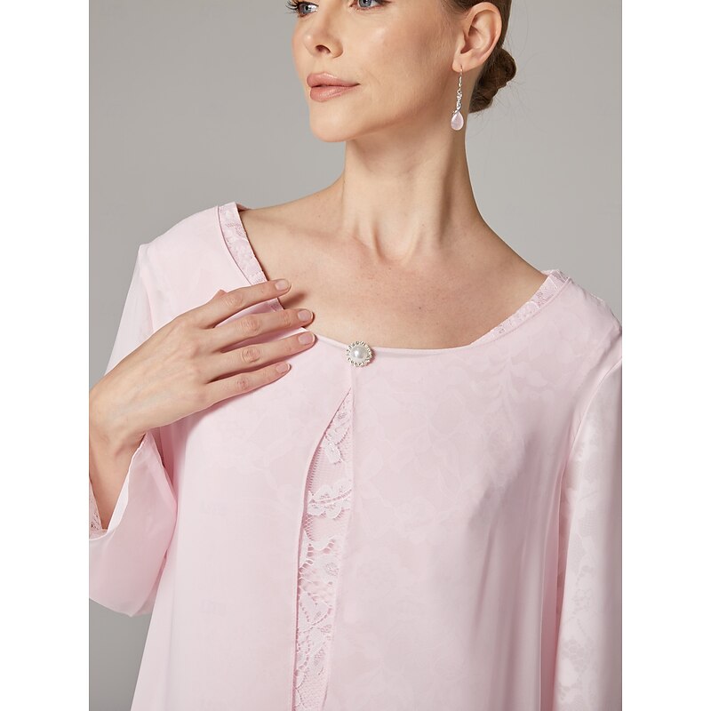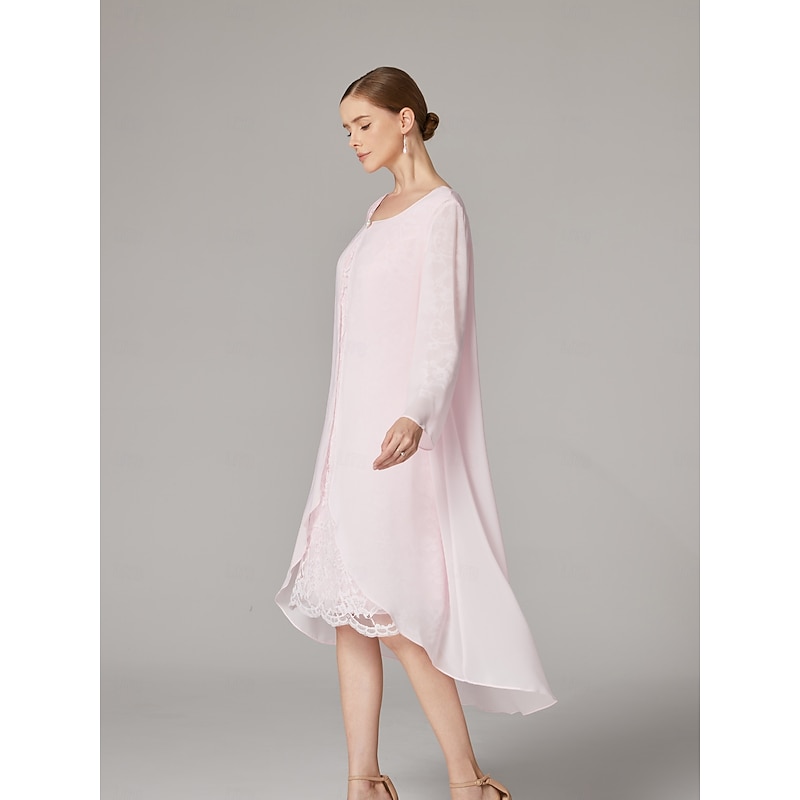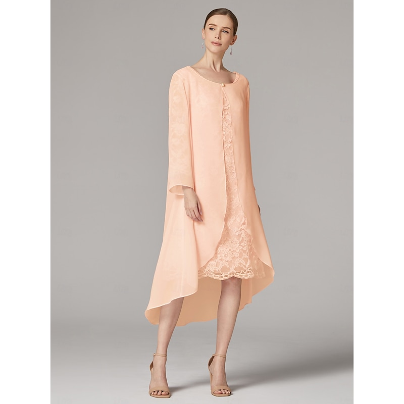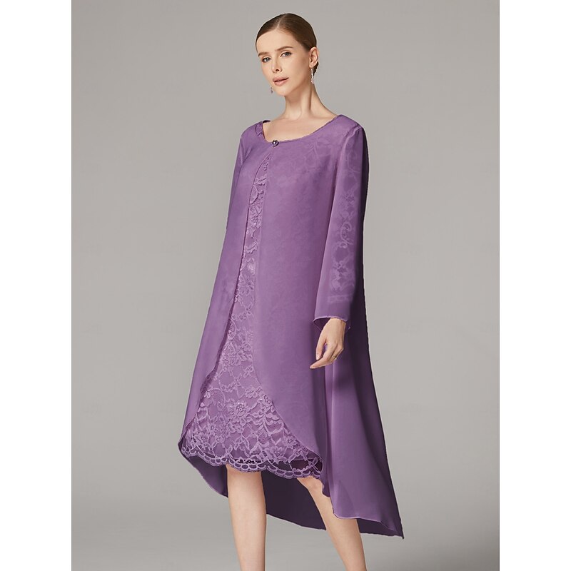 More information about Two Piece A-Line Dress Beach Wedding Suit Mother of the Bride Dress Elegant Plus Size Jewel Neck Tea Length Chiffon Lace Short Sleeve Jacket Dresses with Solid Color
