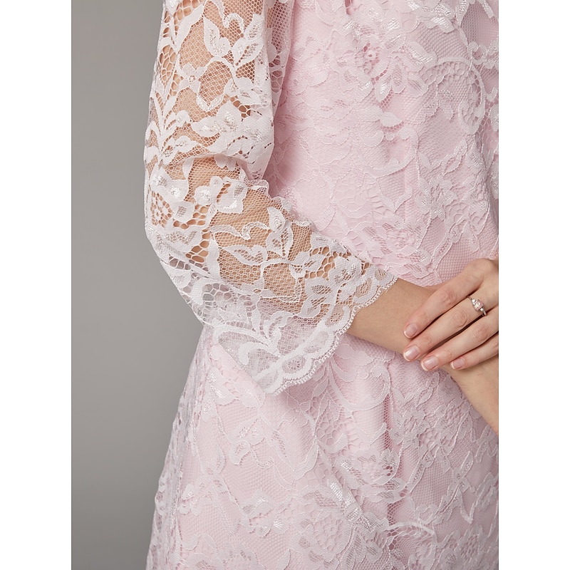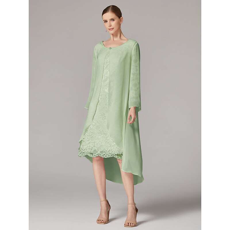 Highlights [Fabric] : Made from elegant chiffon and lace, this dress offers a lightweight, airy feel. The lace inner layer features intricate floral patterns that enhance the dress’s feminine charm. [Silhouette] : The two-piece A-line silhouette, complete with a tea length hemline, ensures a flattering fit for various body types while providing comfort and style. [Design Highlights] : This elegant dress features a jewel neck and a sophisticated short sleeve jacket. The slight high-low hem of the chiffon overlay adds a subtle touch of grace to the ensemble. Built-in bra support ensures comfort and ease of wear. [Occasions] : Perfect for weddings, whether you're the mother of the bride or a wedding guest, this dress offers an elegant choice for formal celebrations and special occasions. [Size Range] : Available in a wide range of sizes from US 0 to US 26W, accommodating various body types. Custom measurements ensure a tailored fit, allowing each wearer to feel confident and comfortable. Choose from beautiful colors like Sage, Sky Blue, Pink, and Blush.