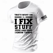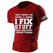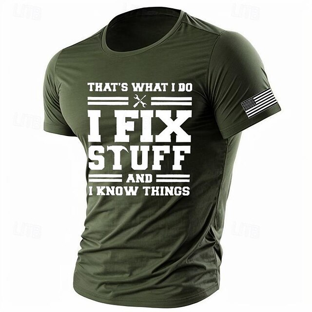 Highlights [Fabric] : This classic short-sleeve t-shirt is crafted from 100% cotton, providing a soft and breathable feel, perfect for summer wear. The fabric's micro-elasticity ensures a comfortable fit that moves with you, making it ideal for everyday use. [Fit] : Designed for a regular fit, this t-shirt offers a flattering silhouette without being too tight, allowing for ease of movement and comfort throughout the day. [Design Highlights] : Featuring a bold national flag graphic on the sleeve and a humorous print, "That's What I Do: I Fix Stuff and I Know Things," on the front, this tee adds a playful and distinctive touch to your casual wardrobe. The classic crew neck design further enhances its timeless appeal. [Occasions] : Whether you're heading out for a vacation, strolling down the street, or enjoying a casual holiday, this t-shirt suits various settings. Its versatile army green shade and stylish design make it perfect for those laid-back, relaxed occasions. [Size Range] : Available in sizes S, M, L, XL, and XXL, this t-shirt caters to a wide range of body types. Make sure to choose the size that best suits your measurements for a comfortable and ideal fit.
