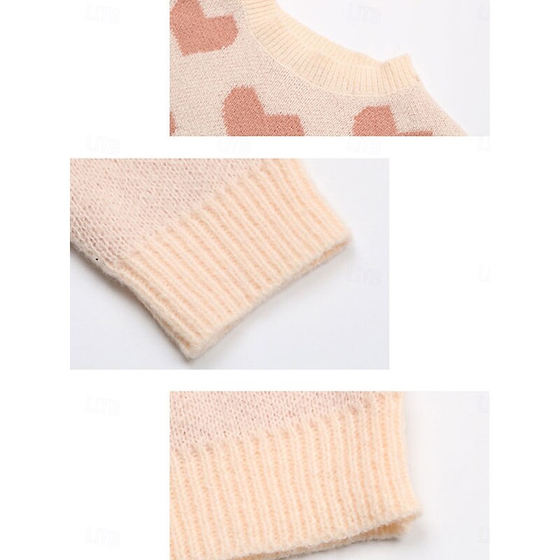 : This charming sweater is adorned with delightful pink hearts on a gentle cream base, adding a playful and feminine touch to your outfit. The ribbed crew neck, cuffs, and hem provide a snug fit, while the overall knitted pattern makes it a standout piece for any casual occasion.
