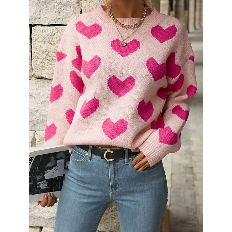 Women's Sweater Pullover Sweater Jumper Casual Soft Heart Ribbed Crew Neck Knitted Long Sleeve Regular Tops Knit Outdoor Daily Weekend Pink Fuchsia Fall Winter