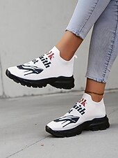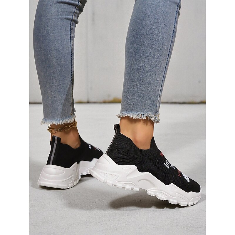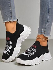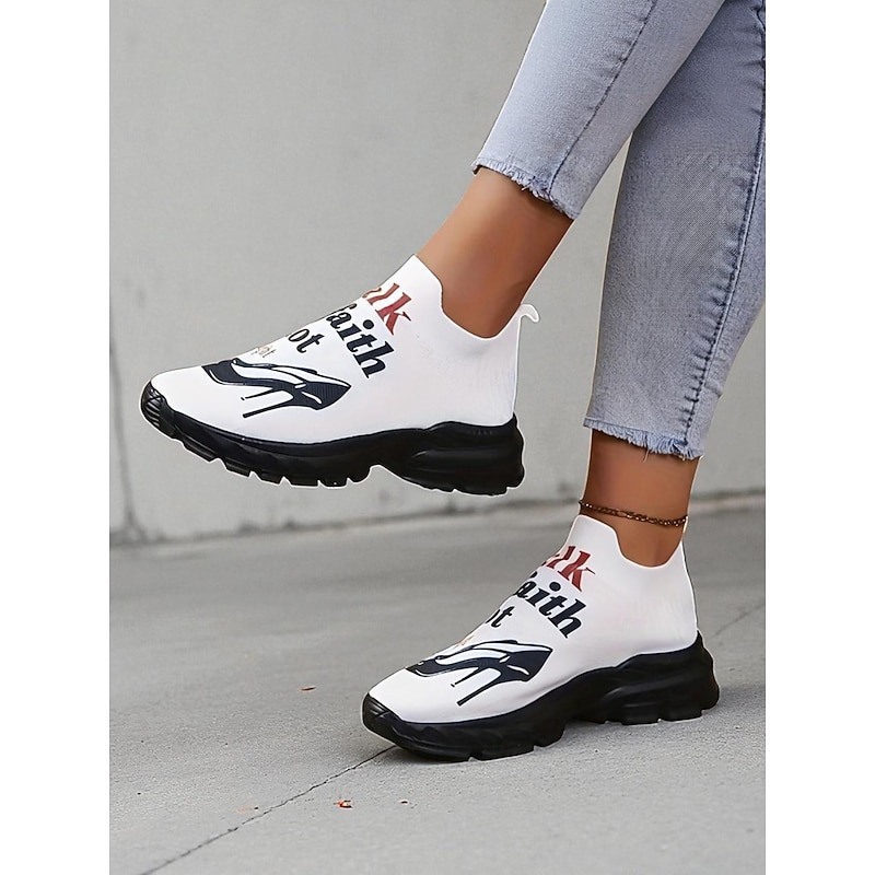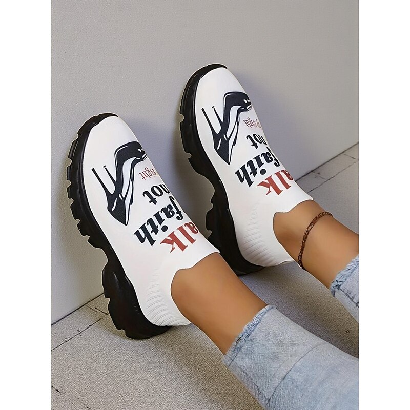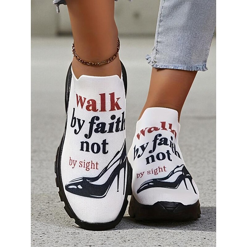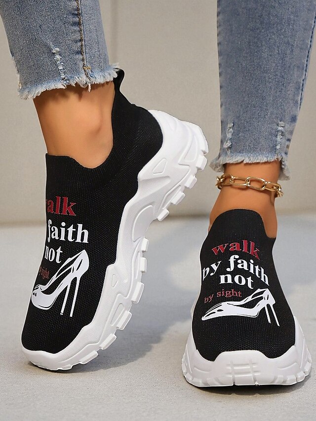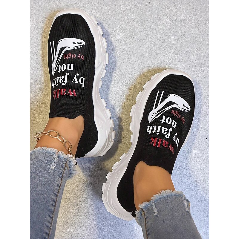 HOT ! Women's Black Flyknit Slip-On Sneakers with Chunky White Sole and Inspirational "Walk by Faith Not by Sight" Print – Casual Comfort Shoes for Daily Wear and Walking