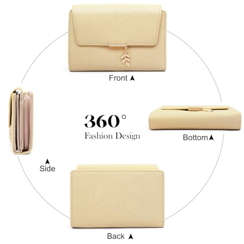 HOT ! Women's Bifold Vegan Leather Wallet RFID Blocking with Leaf Pendant, Compact Card Holder Organizer, Zipper Coin Pocket, ID Window, Multi Card Slots (peach yellow)