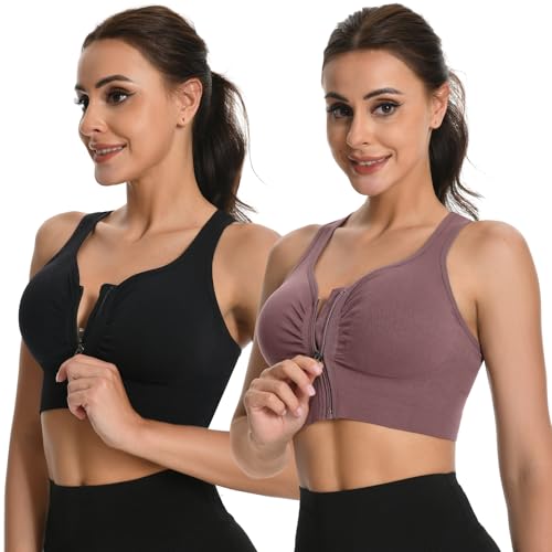 2 Pack Sports Bras for Women Zip Front Closure Yoga Bra Seamless Wirefree Padded High Impact Running Gym Workout Bras 2