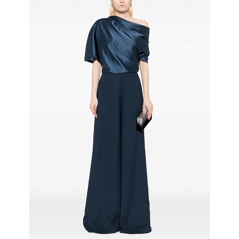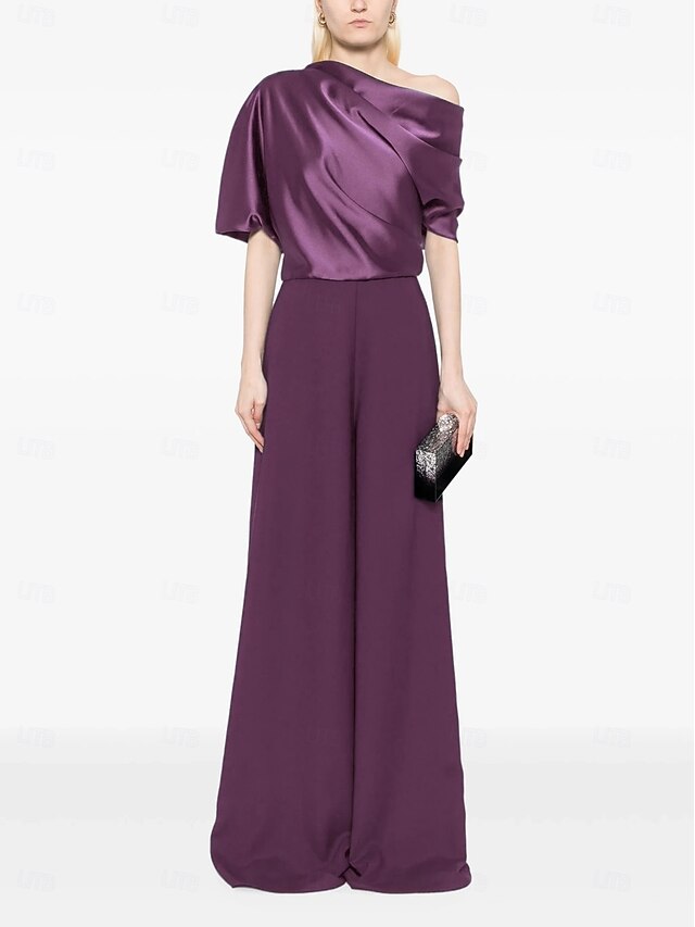 More information about Jumpsuit Mother of the Bride Dress Wedding Guest Simple Minimalist One Shoulder Floor Length Satin Stretch Fabric Short Sleeve with Ruched