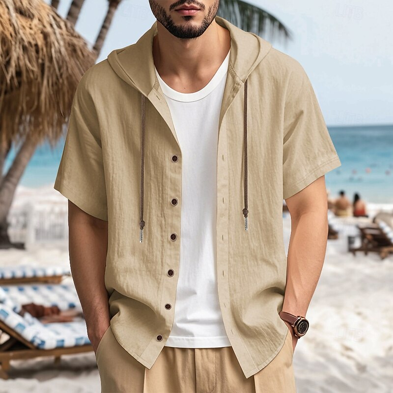 Men's Shirt Linen Shirt Summer Shirt Beach Shirt Solid Color Vacation Casual Black White Blue Khaki Short Sleeve Hooded Summer Spring Clothing Apparel 1