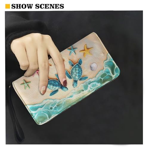 Wanyint Sea Turtle Starfish Beach Women Wallet Purse with Wrist Strap Travel Coin Bag Faux Leather Zipper Closure Clutch Purse Pouch ID Card Holder 1