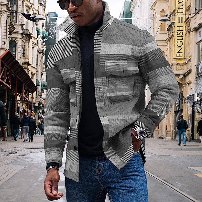 Men's Striped Geometric Pattern Collared Shirt Fleece Shirt Shirt Jacket Long Sleeve Streetwear Sporty Casual Outdoor Daily Going out Summer Spring Turndown Pocket Print Yellow Pink Blue Purple Orange 18