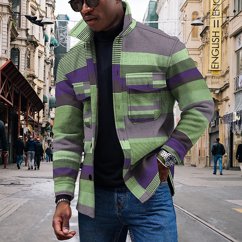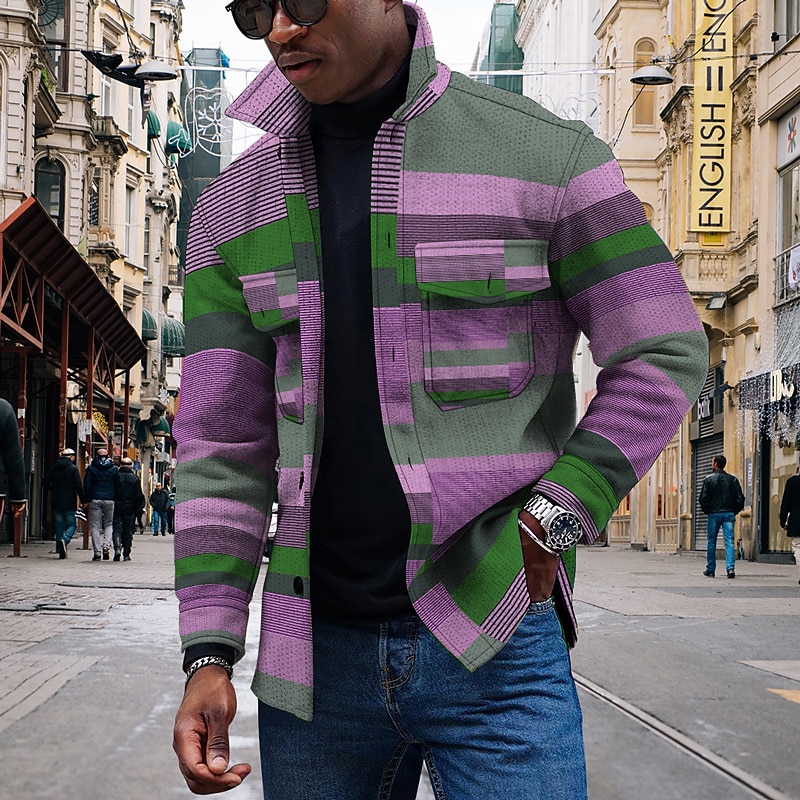 Men's Striped Geometric Pattern Collared Shirt Fleece Shirt Shirt Jacket Long Sleeve Streetwear Sporty Casual Outdoor Daily Going out Summer Spring Turndown Pocket Print Yellow Pink Blue Purple Orange 6