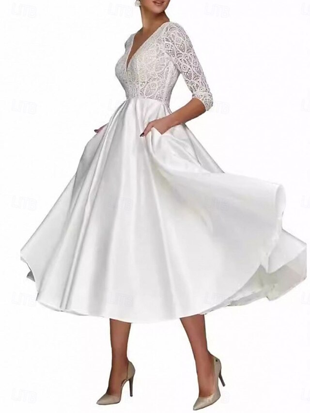 A-Line Mother of the Bride Dress Elegant Simple V Neck Tea Length Polyester 3/4 Length Sleeve with Solid Color 6