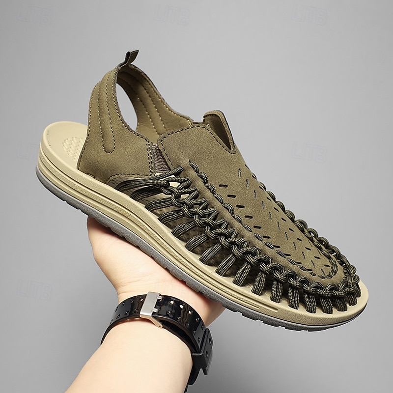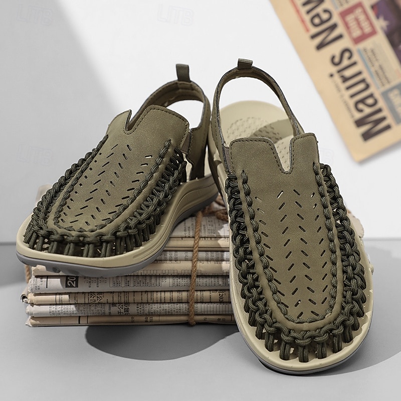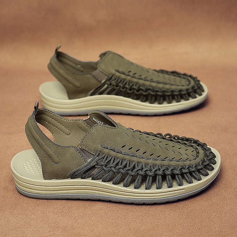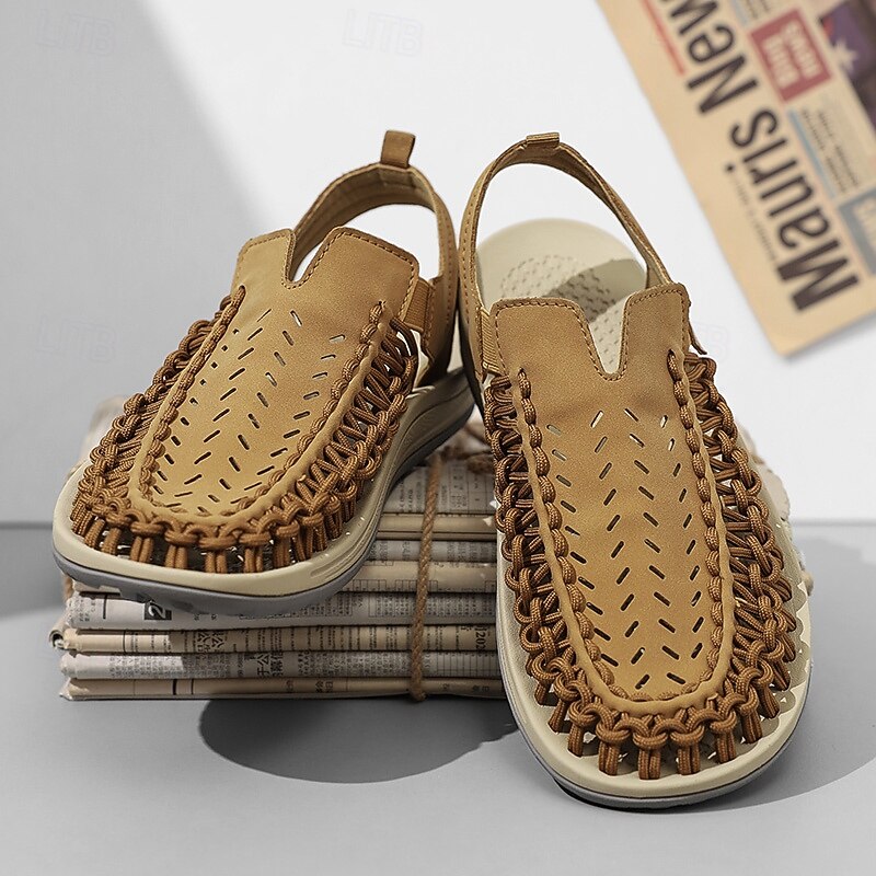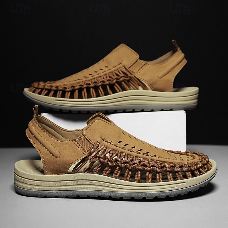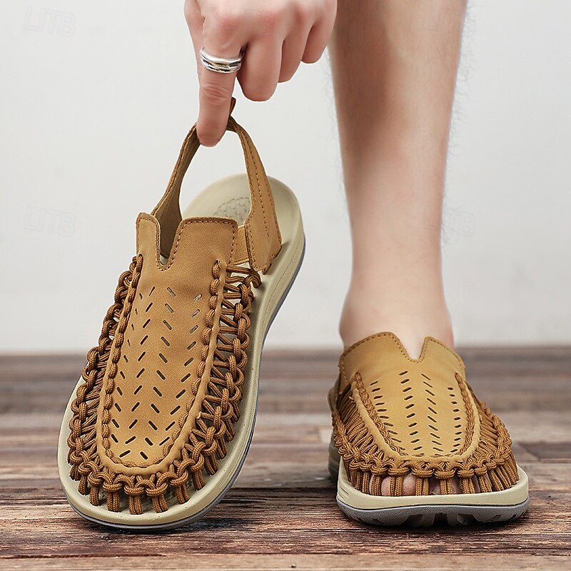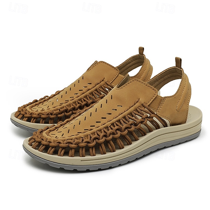 HOT ! Men's Tan Slip-On Outdoor Sandals with Braided Detailing, Casual Style for Summer and Beach Activities