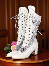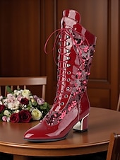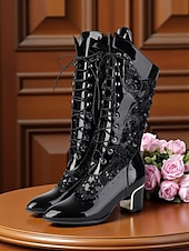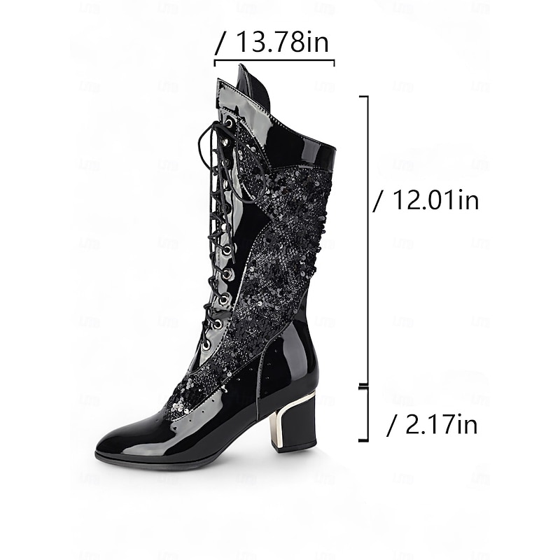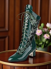 More information about Women's Green Faux Patent Leather Sequin Lace-Up Mid-Calf Boots - Chunky Heel 1930s-Inspired Vintage Boots for Stage Performance,Gothic Parties and Holiday Events